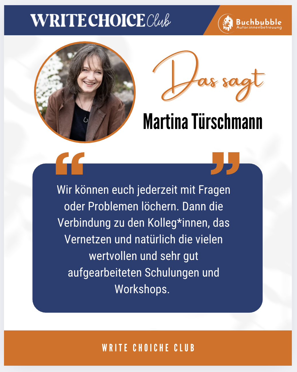 Im Write Choice Club findest du Menschen, die dich verstehen – und Angebote, die dir wirklich weiterhelfen: beim Schreiben, Veröffentlichen und Sichtbarwerden.